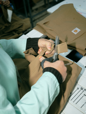 The first step in producing a Carhartt WIP garment starts with the sourcing of fabrics at our HQ in Basel. These fabrics largely come from the EU, as well as Turkey, Egypt, Morocco, and Japan. They are then shipped directly to our logistical platform in Monastir, where they will be checked, prepared and then sent to our own factory, or one of our network of manufacturers in the region. The same process is followed for trims, zips, buttons and so on.