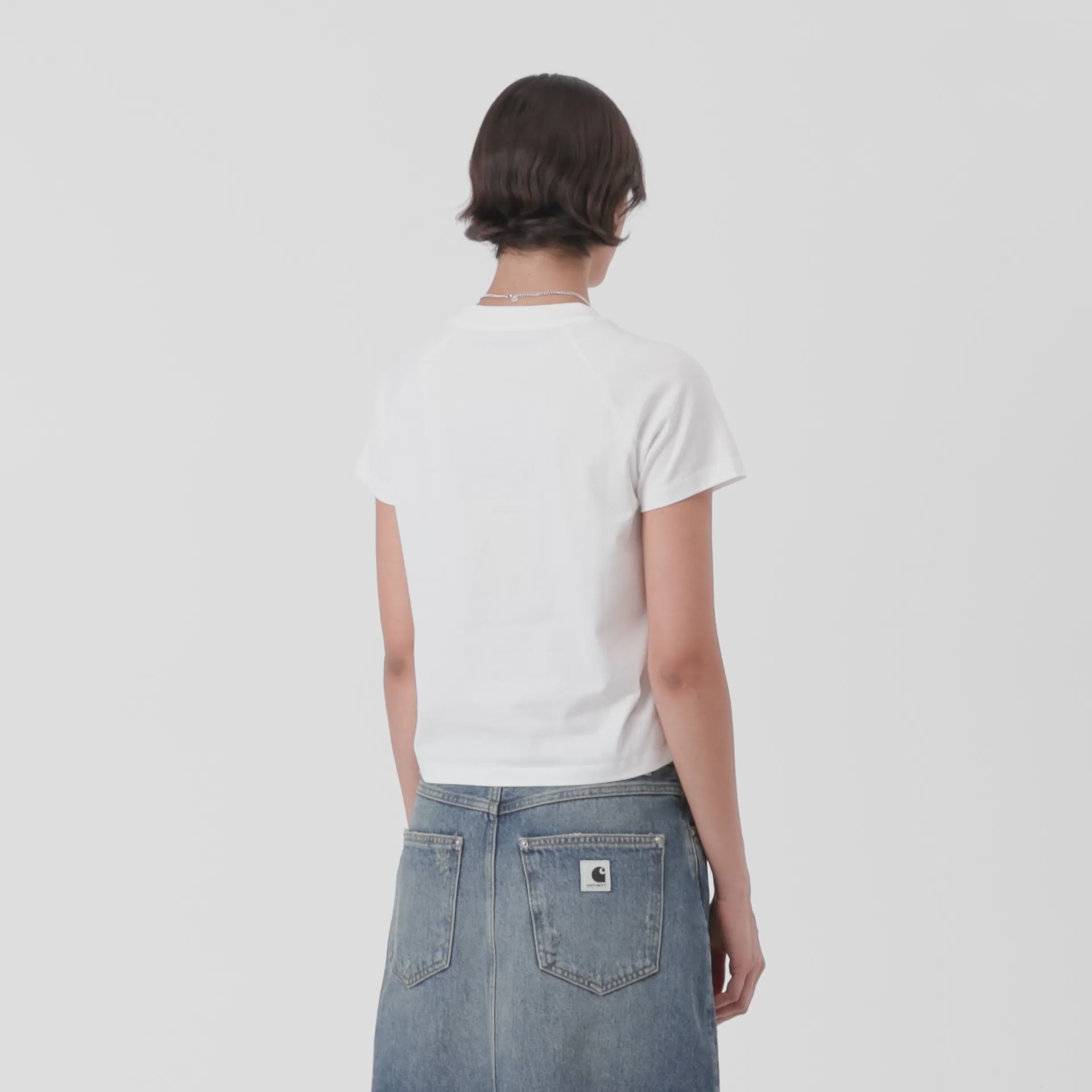 The Women's S/S Honest Work T-Shirt is made in a slim fit from a midweight organic cotton jersey, featuring raglan sleeves. A graphic print appears on the chest.